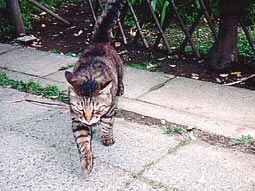 歩いてくるフクちゃんです。 思わずよけます。貫禄です。 縞模様がとてもきれいです。 フクちゃんにはもう会うことができません。 なぜなら車にひかれて死んでしまったから。