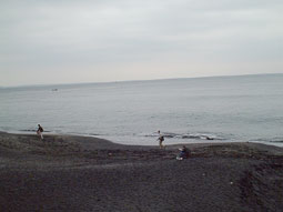 いなむら02 曇天ブルーグレイ 駅からほんの少し歩いて いきなり目が横広にわーっと海。 絵を書いている人、犬の散歩を している人。スローモーション。 ほんと、潮の香りはしないね。 塩分ひかえめ?
